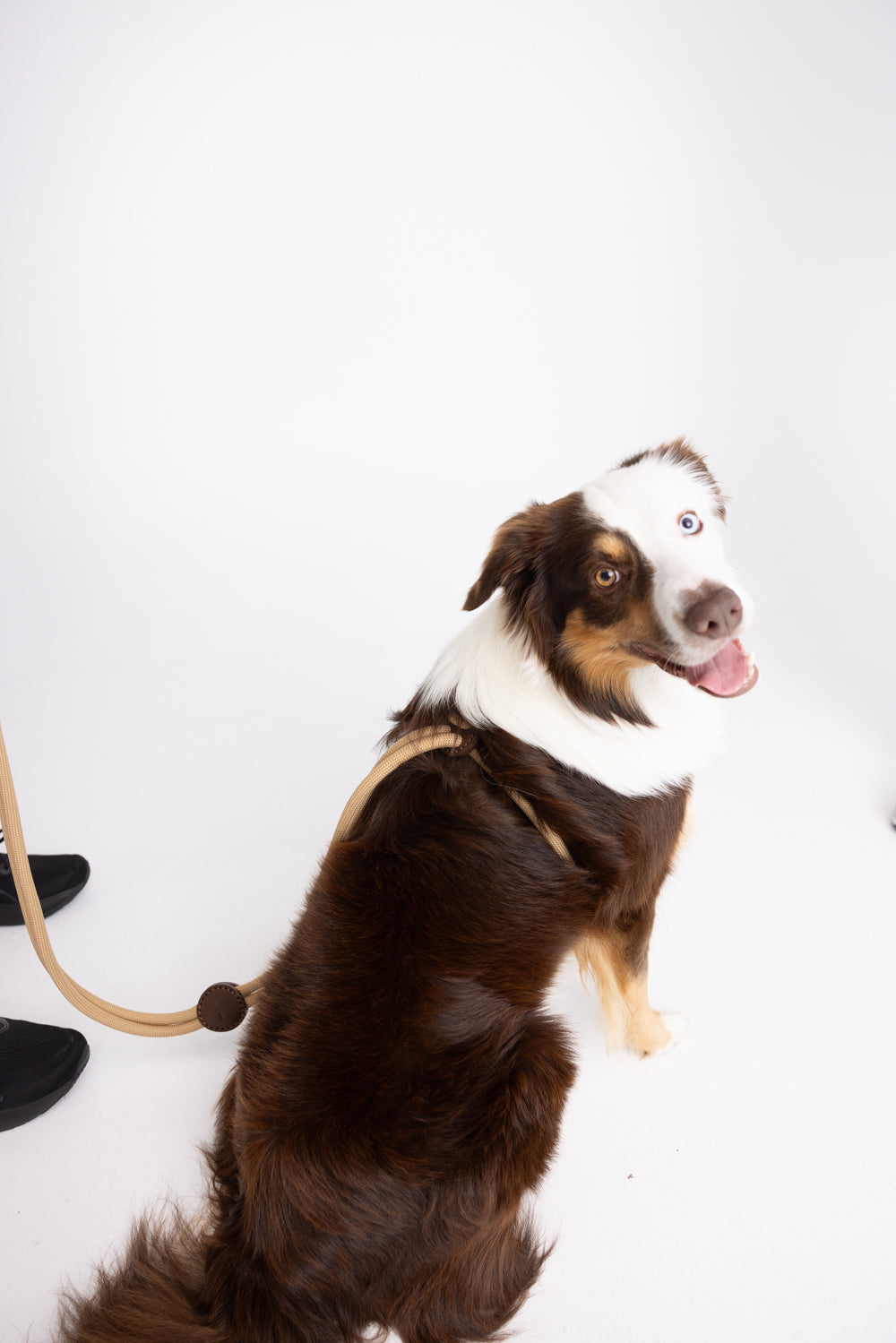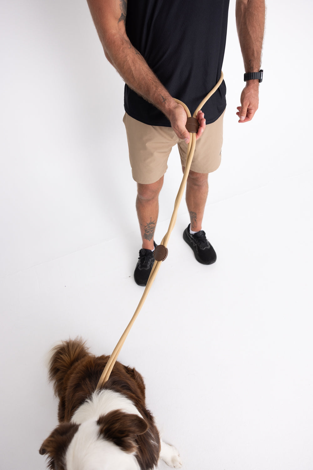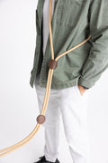 Slide the leather rings along the rope to customize the length or switch between modes. It takes just seconds to transform from a leash to a harness or hands-free setup.